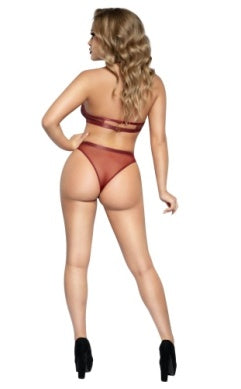Stretch floral lace bra and criss-cross front panty with O-ring details.